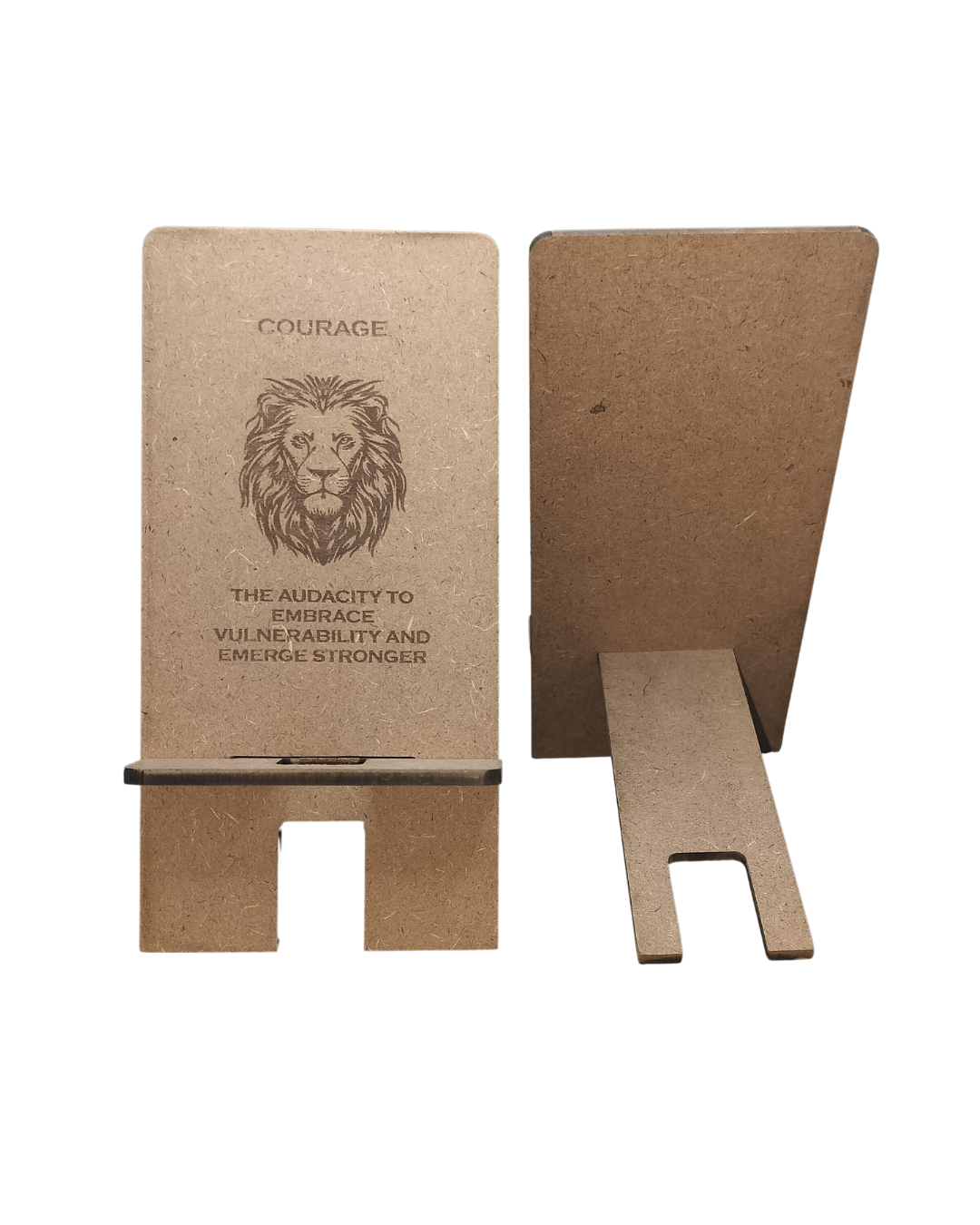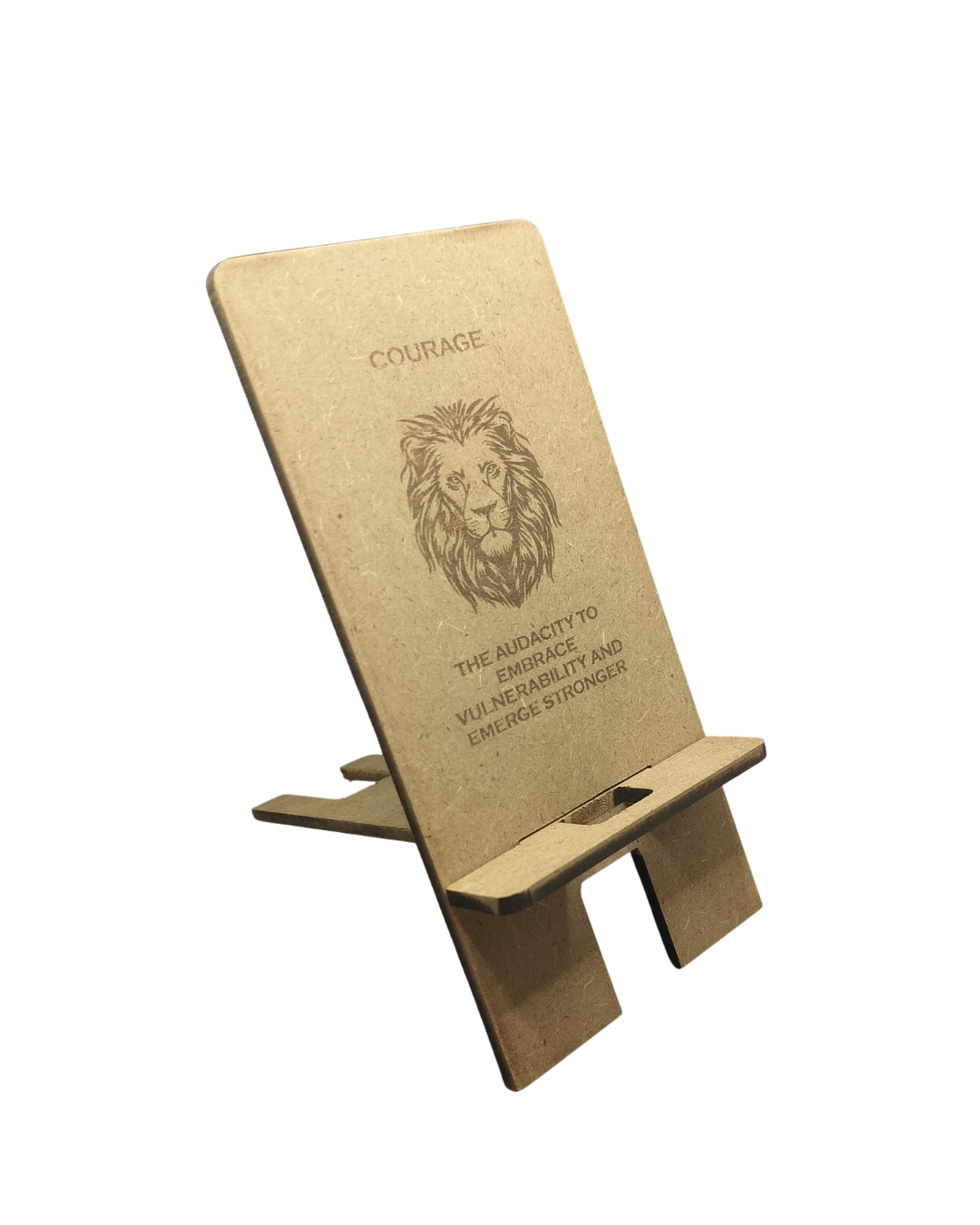 The Hello Wooden Mobile Stand blends wellness, aesthetics, and practical function into one purposeful design. Made from two interlocking wooden pieces, it assembles quickly into a sturdy, ergonomic stand for your smartphone—reducing eye strain, neck pain, and hand fatigue. Use it as a dock, mini-theater, video-call stand, or learning companion. Featuring Courage quote—face challenges with bold determination.